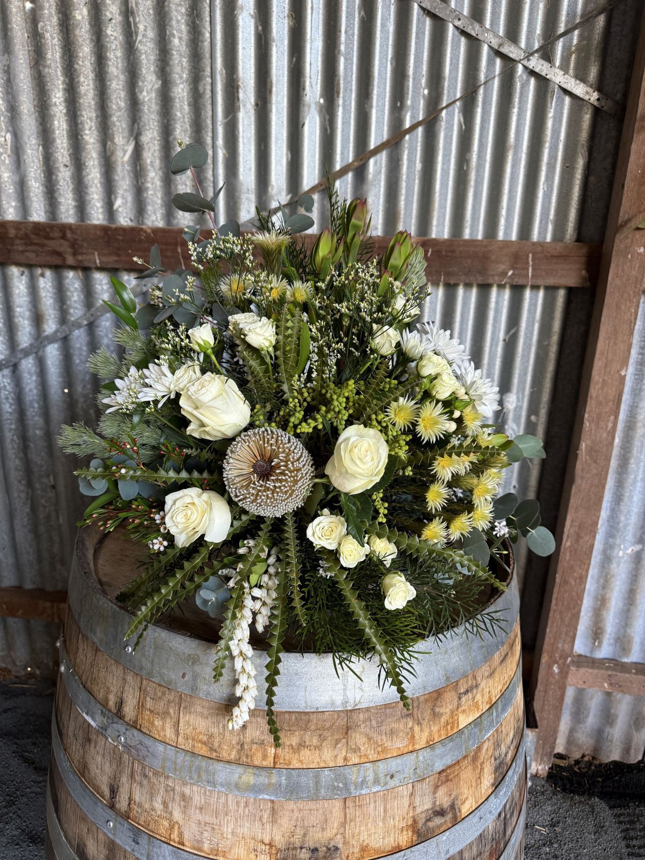 Barrel Arrangement can be done to suit any theme. The arrangement can be placed on any surface to create an elegant whimsical look. We will select the best florals in season keeping with your style.