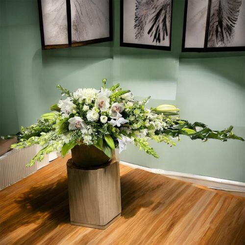 The casket spray is designed to be placed on top of the casket, providing a poignant tribute to the departed. The casket spray is a heartfelt expression of condolences, love, and remembrance, offering solace and comfort to grieving family and friends during a funeral or memorial service.
